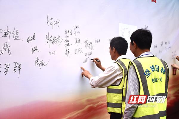 環(huán)衛(wèi)、園林工人在活動簽名墻上留名。