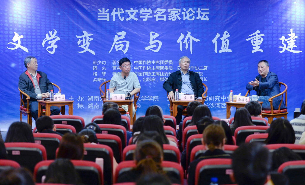 ▲4月28日,"當(dāng)代文學(xué)名家論壇——文學(xué)變局與價(jià)值重建"在中國(guó)書(shū)院博物館報(bào)告廳舉行,著名作家韓少功(左一)、阿來(lái)(左二)、格非與著名評(píng)論家、作家龔曙光(右一)對(duì)談"文學(xué)變局與價(jià)值重建"。組圖/記者辜鵬博